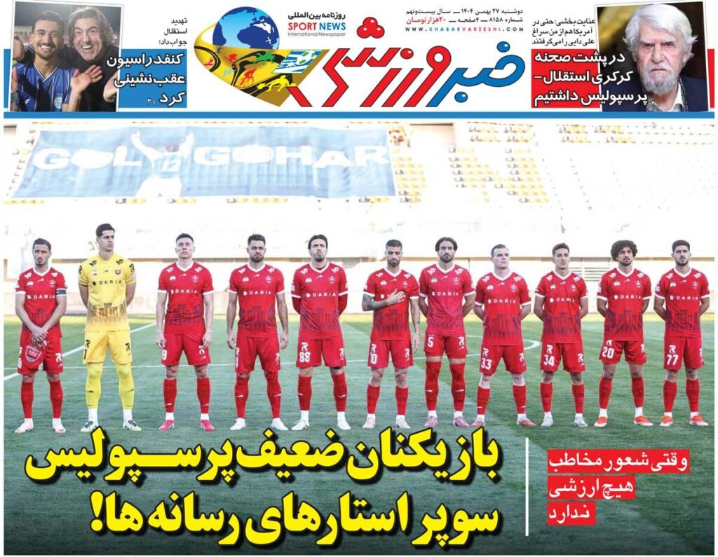 بازیکنان ضعیف پرسپولیس، سوپراستارهای رسانهها!/ روزنامه خبرورزشی دوشنبه را ببینید FYEieHvgyy 1 day ago روزنامه خبرورزشی دوشنبه ۲۷ بهمن ۱۴۰۴ منتشر شد.