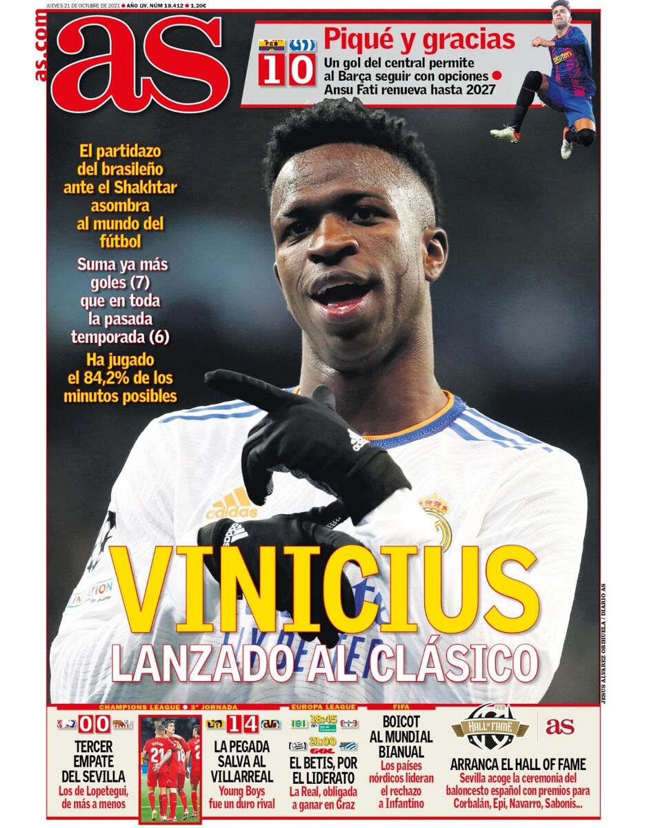 SPORTS روزنامه آ اس| وینیسیوس آماده برای الکلاسیکو By - October 21, 2021 0 88 FacebookTwitterPinterestWhatsApp وینگر برزیلی در آمادهترین حالت به الکلاسیکو رسید. او همین الان هم از کل فصل قبل بیشتر برای رئال گل زده است.