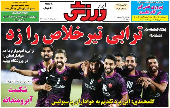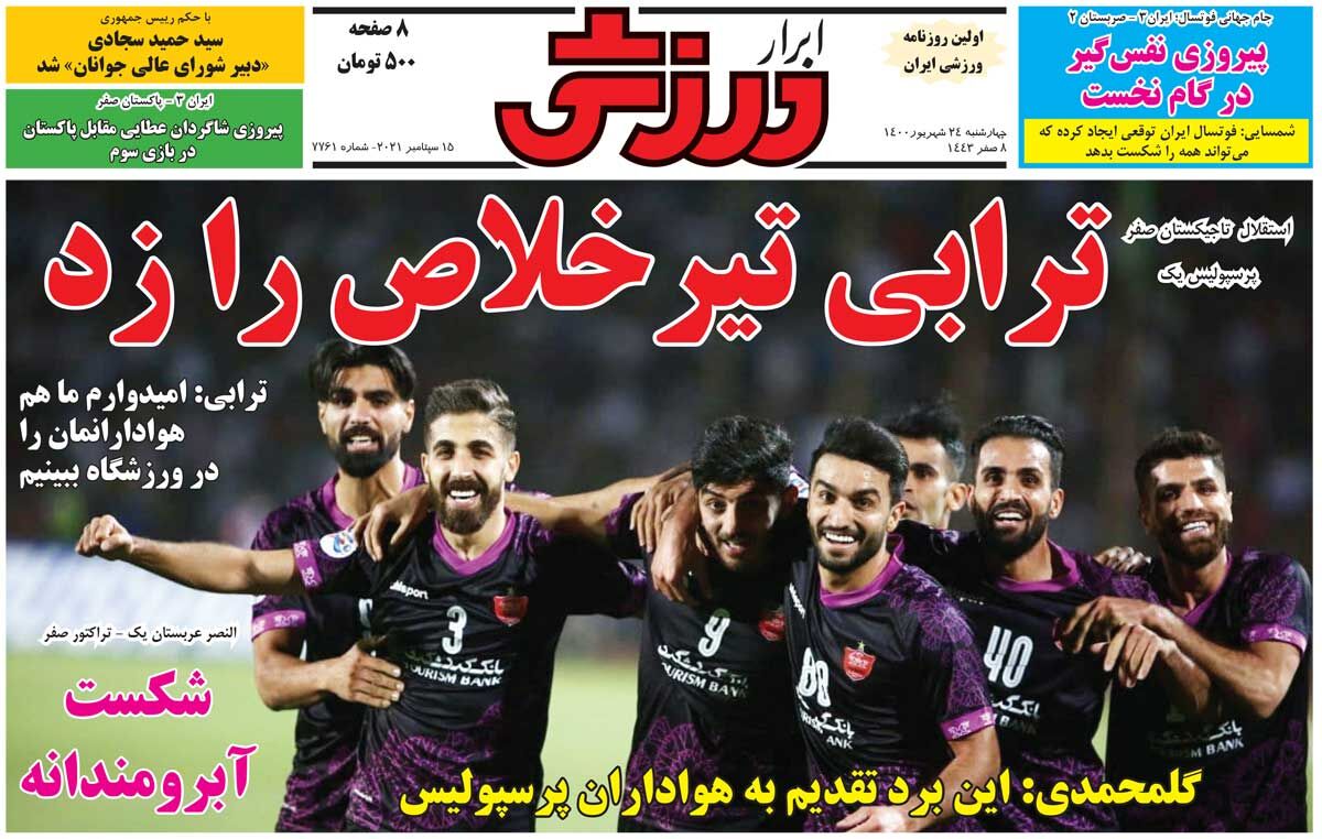 SPORTS روزنامه ابرار ورزشی| ترابی تیر خلاص را زد By - September 14, 2021 0 103 FacebookTwitterPinterestWhatsApp جلد روزنامه ابرارورزشی چهارشنبه ۲۴ شهریور را میبینید.
