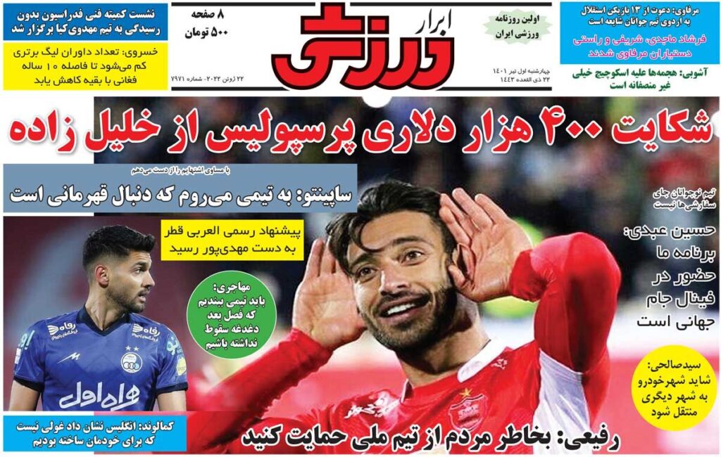 روزنامه ابرار ورزشی| شکایت ۴۰۰هزار دلاری پرسپولیس از خلیلزاده 3 years ago جلد روزنامه ابرار ورزشی چهارشنبه ۱ تیر را میبینید.