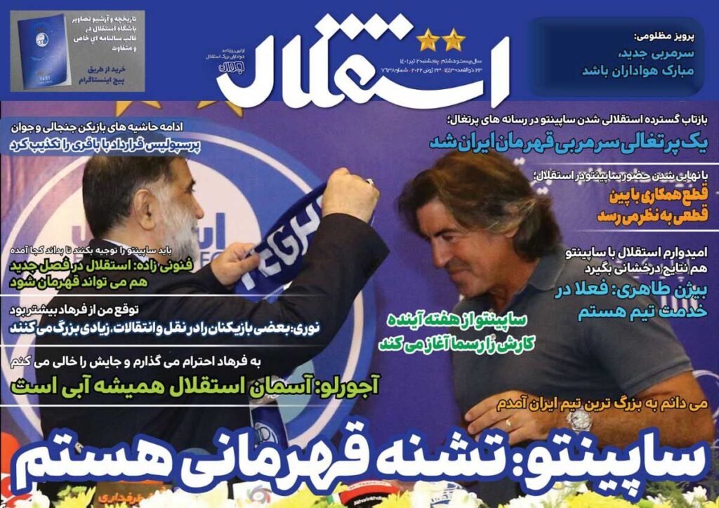 روزنامه استقلال جوان| ساپینتو: تشنه قهرمانی هستم 3 years ago جلد روزنامه استقلال جوان پنجشنبه ۲ تیر را میبینید.