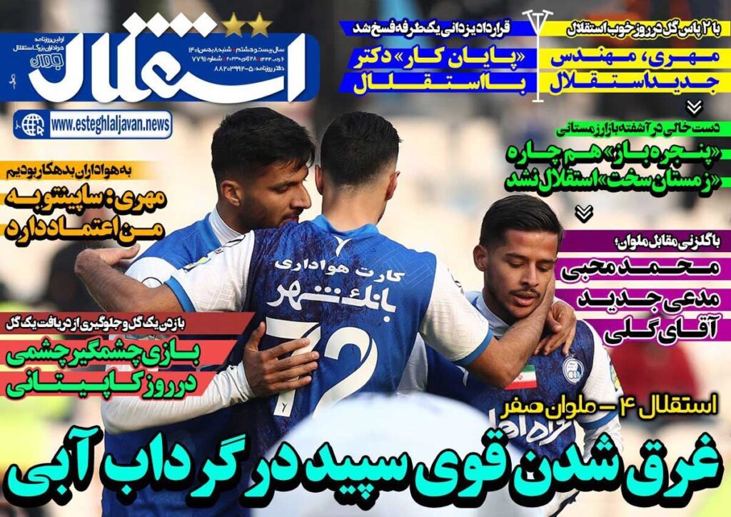 روزنامه استقلال جوان غرقشدن قوی سپید در گرداب آبی 3 years ago جلد روزنامه استقلال جوان شنبه ۸ بهمن را میبینید.