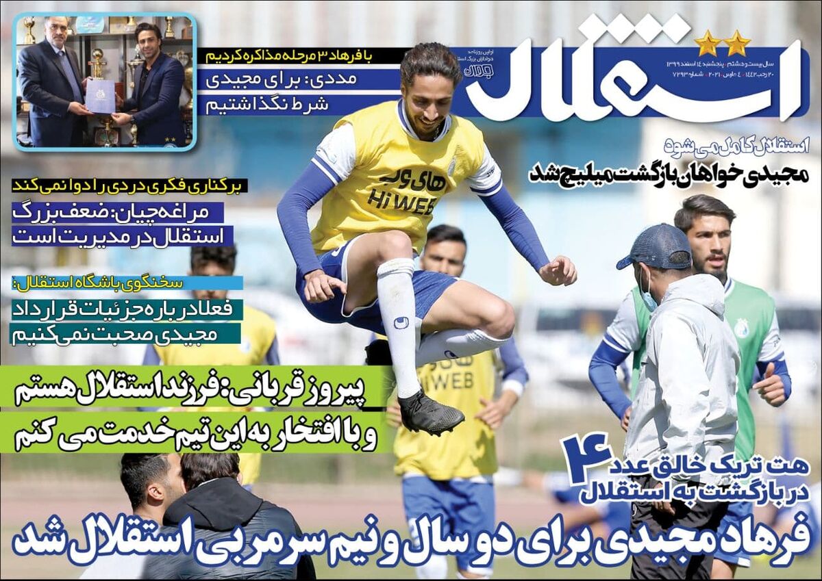 SPORTS روزنامه استقلال جوان| فرهاد مجیدی برای ۲ سال و نیم سرمربی استقلال شد By - March 3, 2021 0 96 FacebookTwitterPinterestWhatsApp جلد روزنامه استقلال جوان پنجشنبه ۱۴ اسفند را میبینید.