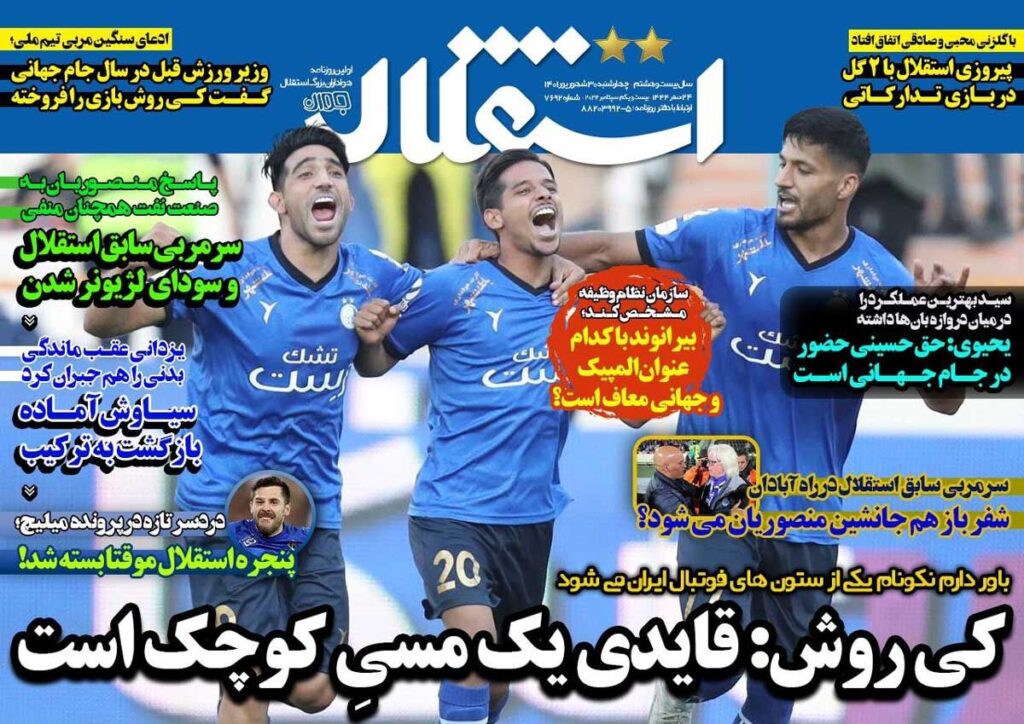 روزنامه استقلال جوان کیروش: قایدی یک مسیِ کوچک است 3 years ago جلد روزنامه استقلال جوان چهارشنبه ۳۰ شهریور را میبینید.