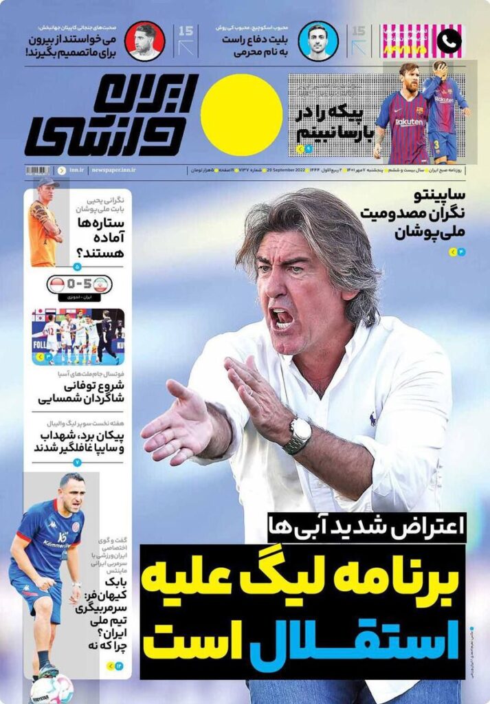 روزنامه ایران ورزشی برنامه لیگ علیه استقلال است 3 years ago جلد روزنامه ایران ورزشی پنجشنبه ۷ مهر را میبینید.