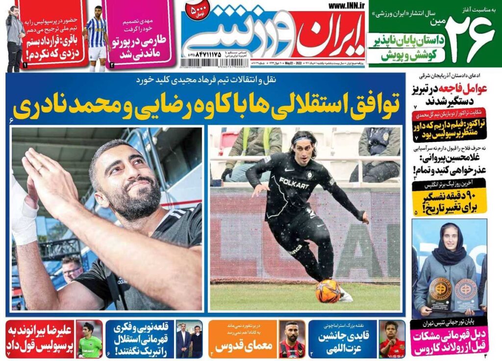 روزنامه ایران ورزشی| توافق استقلالیها با کاوه رضایی و محمد نادری 4 years ago جلد روزنامه ایران ورزشی یکشنبه ۱ خرداد را میبینید.