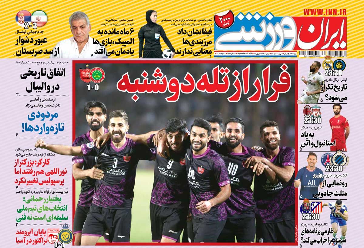 SPORTS روزنامه ایران ورزشی| فرار از تله دوشنبه By - September 14, 2021 0 99 FacebookTwitterPinterestWhatsApp جلد روزنامه ایران ورزشی چهارشنبه ۲۴ شهریور را میبینید.