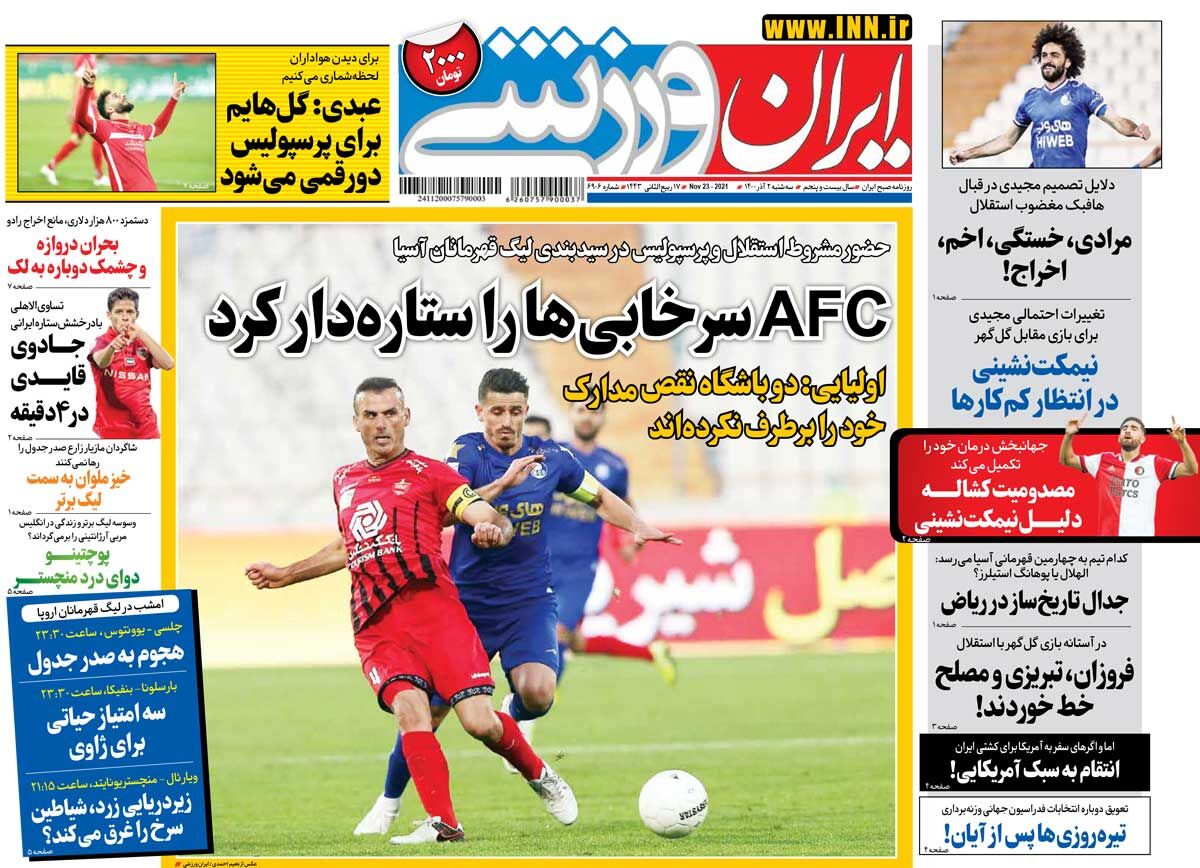 SPORTS روزنامه ایران ورزشی| AFC سرخابیها را ستارهدار کرد By - November 22, 2021 0 76 FacebookTwitterPinterestWhatsApp جلد روزنامه ایران ورزشی سهشنبه ۲ آذر را میبینید.