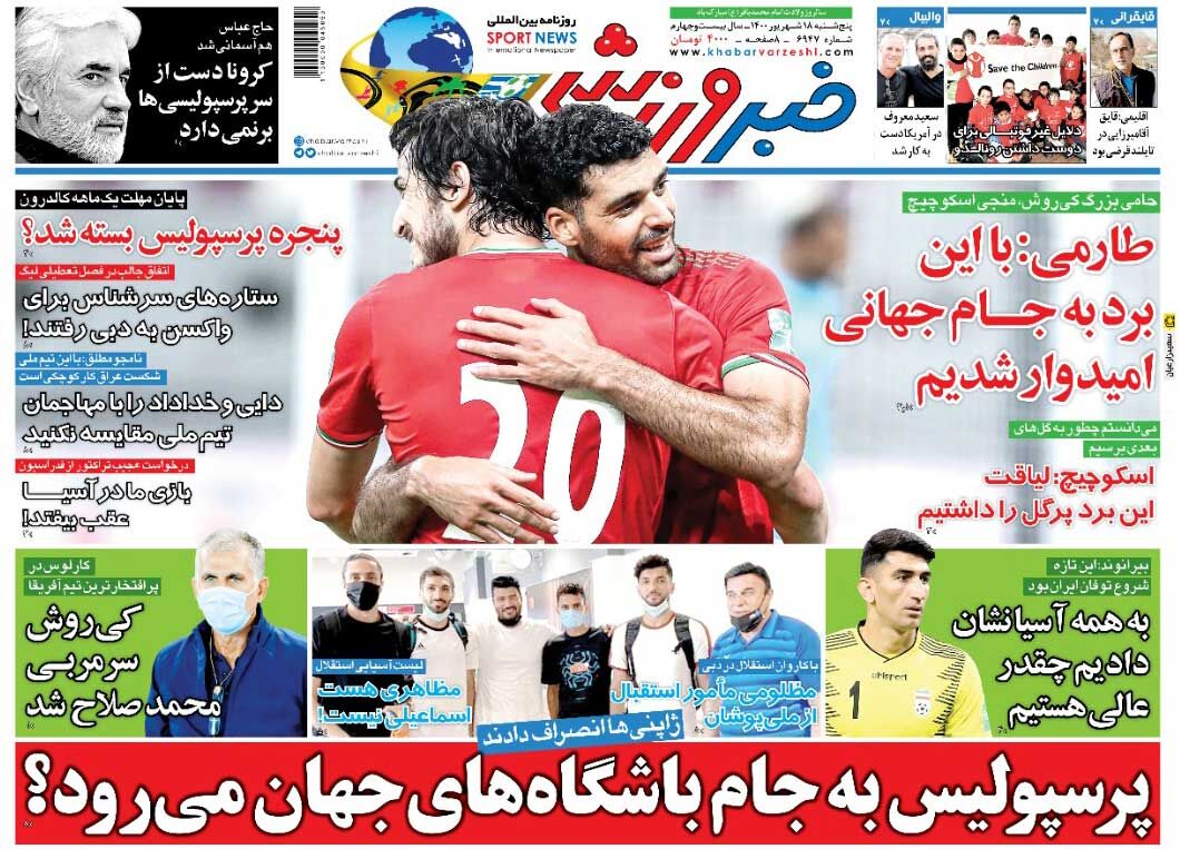 SPORTS روزنامه خبرورزشی| پرسپولیس به جام باشگاههای جهان میرود؟ By - September 8, 2021 0 104 FacebookTwitterPinterestWhatsApp جلد روزنامه خبرورزشی پنجشنبه ۱۸ شهریور را میبینید.