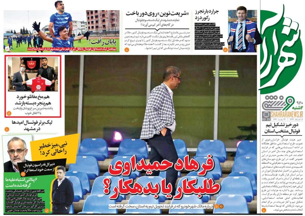 روزنامه شهرآرا ورزشی| فرهاد حمیداوی، طلبکار یا بدهکار؟ 5 years ago صفحه ورزشی روزنامه شهرآرا دوشنبه ۱۸ اسفند را میبینید.