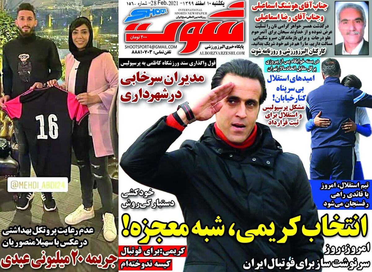 SPORTS روزنامه شوت| انتخاب کریمی، شبه معجزه! By - February 27, 2021 0 109 FacebookTwitterPinterestWhatsApp جلد روزنامه شوت یکشنبه ۱۰ اسفند را میبینید.