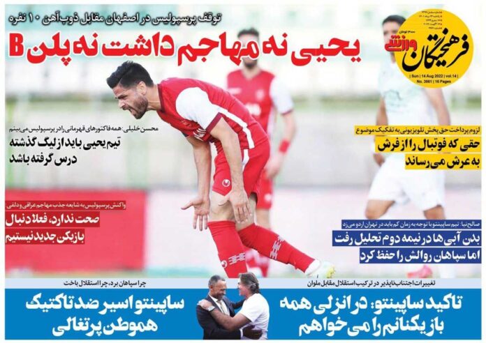 SPORTS روزنامه فرهیختگان ورزشی یحیی نه مهاجم داشت نه پلن B By - August 13, 2022 0 79 FacebookTwitterPinterestWhatsApp جلد روزنامه فرهیختگان ورزشی یکشنبه ۲۳ مرداد را میبینید.