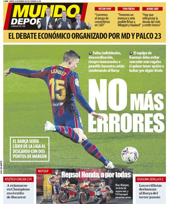 SPORTS روزنامه موندو| جای اشتباه بیشتر نیست By - February 23, 2021 0 117 FacebookTwitterPinterestWhatsApp چوب خط اشتباهات دفاعی بارسلونا پر شده است. اگر بارسا میخواهد برای کسب قهرمانی لالیگا رقابت کند، باید در دفاع کمتر اشتباه داشته باشد.