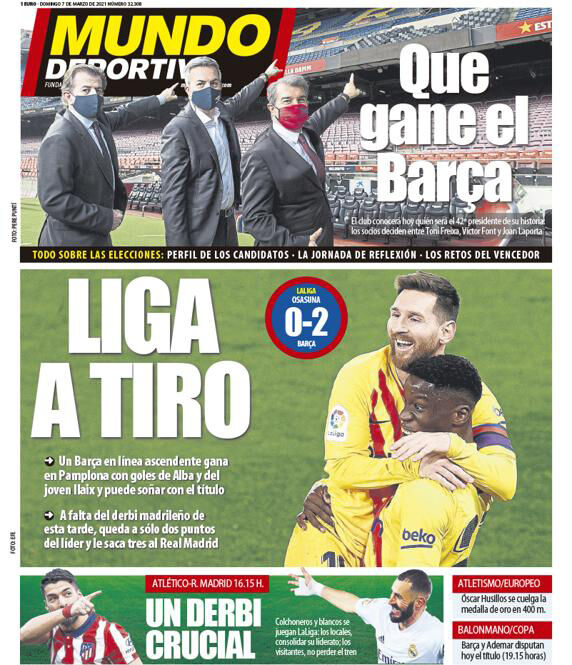 SPORTS روزنامه موندو| محدوده لالیگا By - March 7, 2021 0 103 FacebookTwitterPinterestWhatsApp بارسلونا خودش را مدعی قهرمانی کرد. برد ۲ گله مقابل اوساسونا با پاسگلهای مسی، بارسا را به ۲ امتیازی صدر رساند.