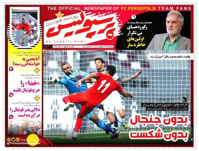 SPORTS روزنامه پرسپولیس| بدون جنجال، بدون شکست By - September 8, 2021 0 99 FacebookTwitterPinterestWhatsApp جلد روزنامه پرسپولیس پنجشنبه ۱۸ شهریور را میبینید.