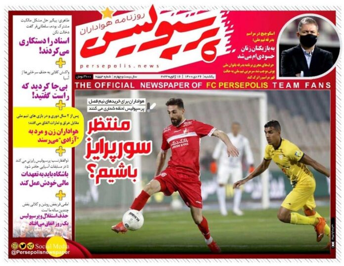 SPORTS روزنامه پرسپولیس| منتظر سورپرایز باشیم؟ By - January 15, 2022 0 86 FacebookTwitterPinterestWhatsApp جلد روزنامه پرسپولیس یکشنبه ۲۶ دی را میبینید.
