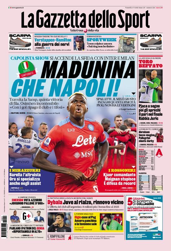 SPORTS روزنامه گاتزتا| چه ناپولیای! By - September 24, 2021 0 100 FacebookTwitterPinterestWhatsApp ناپولی با ۴ گل سامپدوریا را شکست داد. تیم لوچانو اسپالتی به پنجمین برد متوالیاش در شروع فصل جدید سری آ ایتالیا رسید.