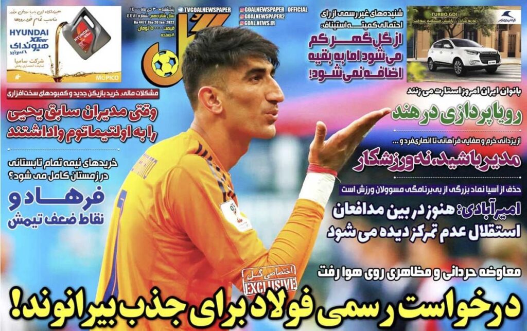 روزنامه گل| درخواست رسمی فولاد برای جذب بیرانوند! 4 years ago جلد روزنامه گل پنجشنبه ۳۰ دی را میبینید.