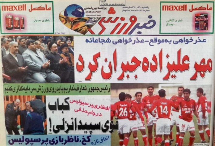 SPORTS عذرخواهی بهموقع – عذرخواهی شجاعانه By - December 1, 2022 0 98 FacebookTwitterPinterestWhatsApp جلد روزنامه خبرورزشی یکشنبه ۱۰ آذر ۱۳۸۱ را میبینید.