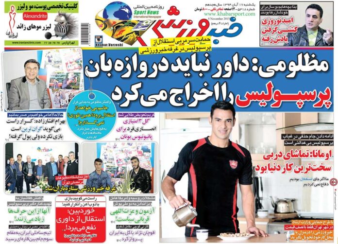 عکس جلد روزنامه خبرورزشی در تاریخ ۱۷ آبان ۱۳۹۴ را ملاحظه می‌کنید.