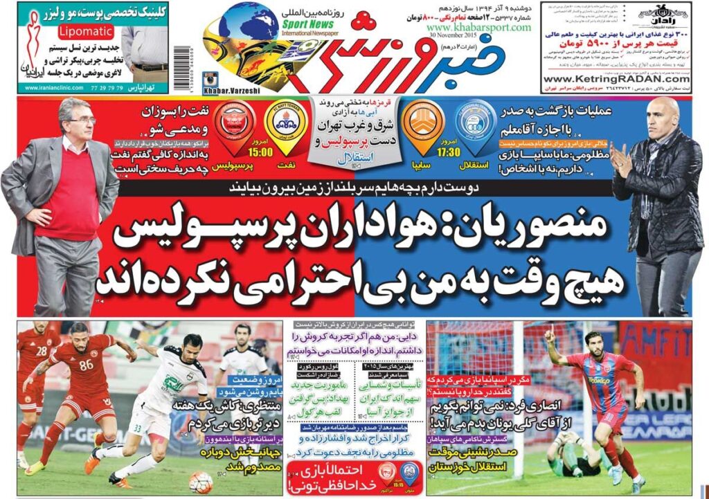 ۱۰ سال گذشت| منصوریان: هواداران پرسپولیس هیچ وقت به من بیاحترامی نکردهاند FYEieHvgyy 3 hours ago عکس جلد روزنامه خبرورزشی در تاریخ ۹ آذر سال ۱۳۹۴ را ملاحظه میکنید.
