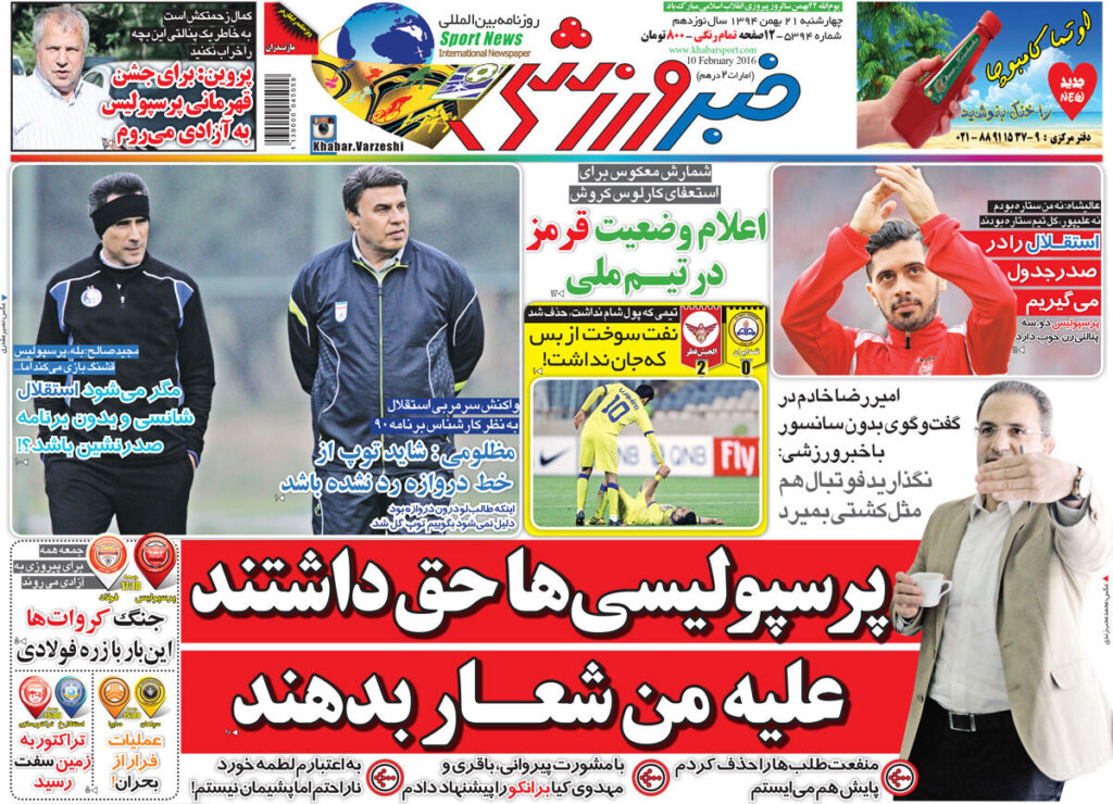 ۱۰ سال گذشت| پرسپولیسیها حق داشتند علیه من شعار بدهند FYEieHvgyy 1 week ago عکس جلد روزنامه خبرورزشی در تاریخ ۲۱ بهمن ۱۳۹۴ را ملاحظه میکنید.
