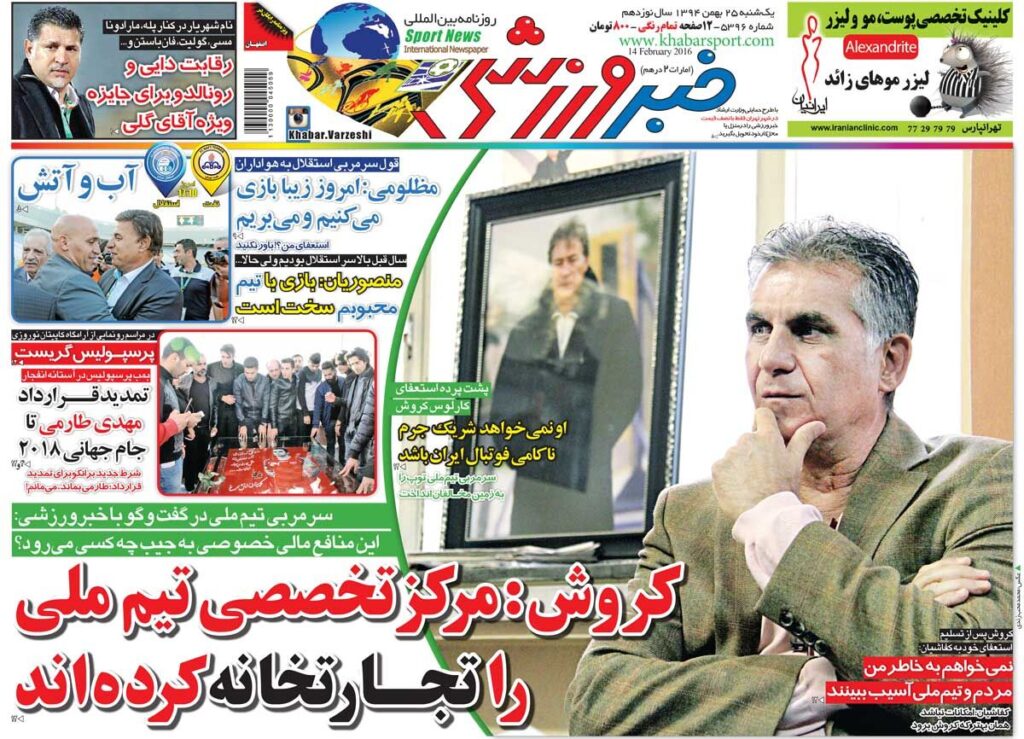 ۱۰ سال گذشت| کیروش: مرکز تخصصی تیم ملی را تجارتخانه کردهاند FYEieHvgyy 3 days ago عکس جلد روزنامه خبرورزشی در تاریخ ۲۵ بهمن ۱۳۹۴ را ملاحظه میکنید.
